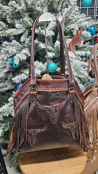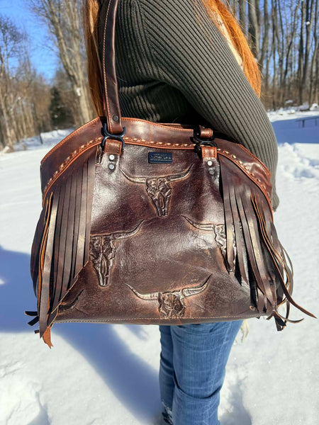 Crafted from rich, rugged leather and detailed with bold longhorn tooling, this bag blends heritage craftsmanship with everyday function. Western fringe adds movement and personality, while sturdy black strap anchors and hardware bring a striking contrast and durability you can trust.