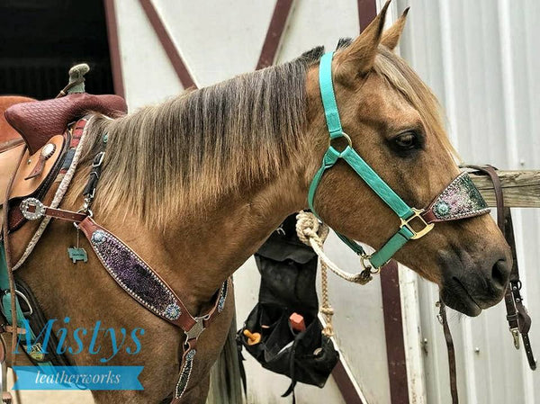 Transform your horse's look with our Mermaid Bronc Noseband! The stunning mermaid color shifting design is sure to turn heads. Crafted with quality leather and lined for durability and easy cleaning.