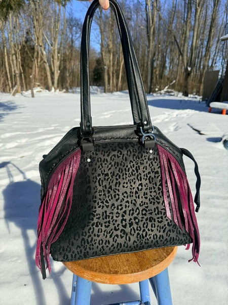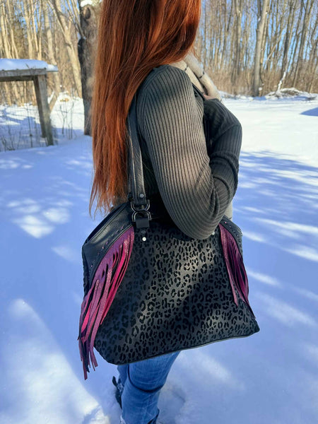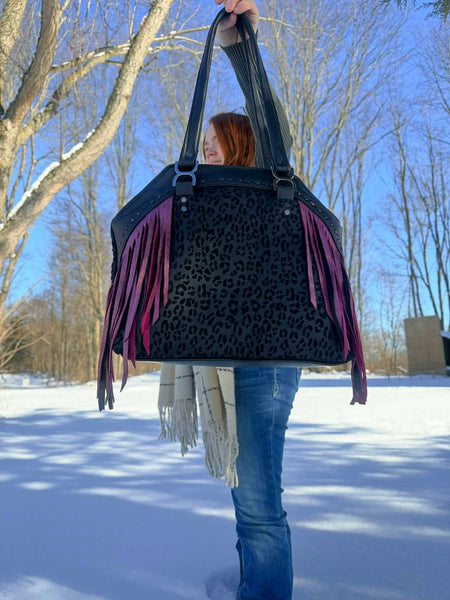 Crafted from rich black leopard leather and framed with deep plum fringe, this bag blends rugged ranch vibes with a touch of wild luxury. The structured silhouette keeps its shape while still offering plenty of room for your everyday essentials — from long days on the go to nights out under neon lights.